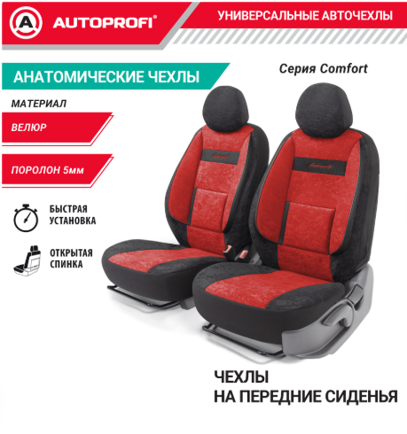 1. Комплект чехлов на передние сиденья COMFORT, материал велюр COM-0405 BK/RDПодарите комфорт и уют в автомобиле! Чехлы на передние сиденья COMFORT из велюра не только выглядят стильно, но и обеспечивают максимальный комфорт благодаря анатомическим подушкам и поясничному упору. Они универсальны, долговечны и подходят для большинства моделей автомобилей.