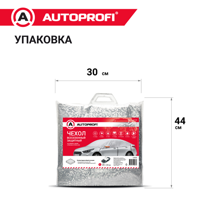 Чехол всесезонный защитный AUTOPROFI на лобовое, заднее и боковые стекла автомобиля, размер L, 292х249 см, прочный двухслойный материал: фольгированный полиэтилен (PE) и слой синтетического полимерного волокна (PP).