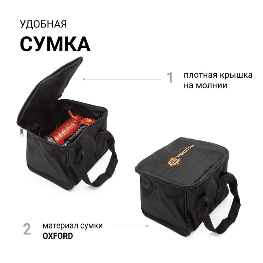 Компрессор воздушный АГРЕССОР, 50 л./мин., 12V/23A, 280W, 10 Атм., съёмный шланг 5 м., клапан для регулир. давления, питание от АКБ, LED фонарь, защита от перегрева, набор из 4-х переходников для надувн. изделий, переходники для накач. лодок, сумка