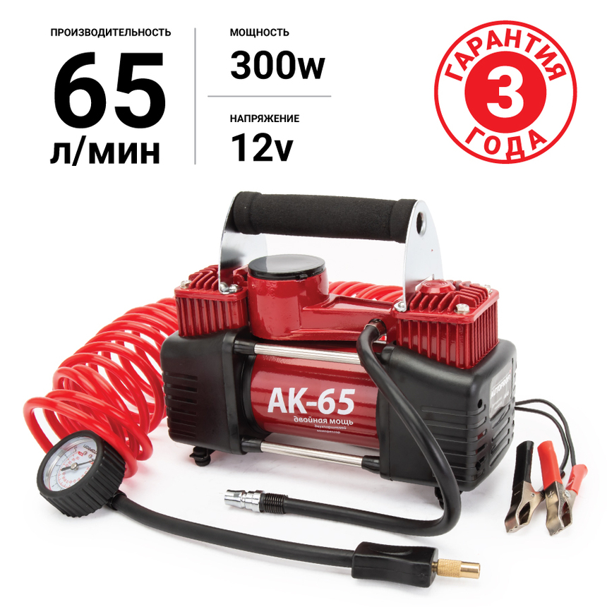 Двух поршневой автомобильный компрессор AK-65 предназначен для накачивания шин легковых автомобилей, кроссоверов, внедорожников, а также лёгкого коммерческого транспорта. Имеет производительность 65 л/мин и создаёт максимальное давление 10 Атм. Подключается к клеммам. Напряжение 12V.