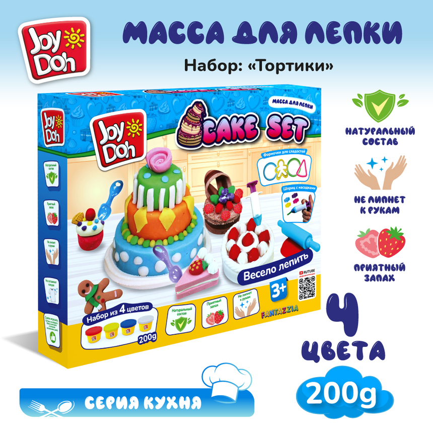Масса для лепки Joy Doh, набор CAKE SET - ТОРТИКИ, 4 баночки с тестом (4 х 50г.), формочки для пирожных и тортов, 14 аксессуаров
