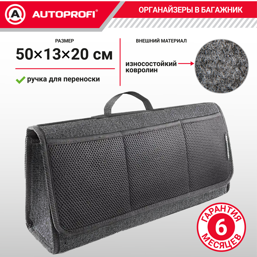Автомобильный органайзер-сумка из ковролина. Цвет серый с характерной фактурой. Материал износостойкий и рассчитан на хранение в багажнике. В таком органайзере можно разместить автохимию, инструменты, автоаксессуары. Размер 50х13х20 см.