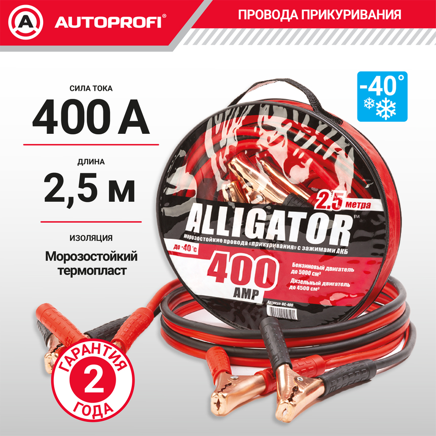 Надёжный и практичный аксессуар – комплект проводов «прикуривания» BC-400 из классической серии «Alligator». Провода обладают длиной 2,5 метра и пропускают ток силой до 400 ампер. Это позволяет использовать их для запуска автомобилей, оснащённых бензиновыми двигателями объёмом до 5 литров или дизельными – объёмом до 4,5 литра.