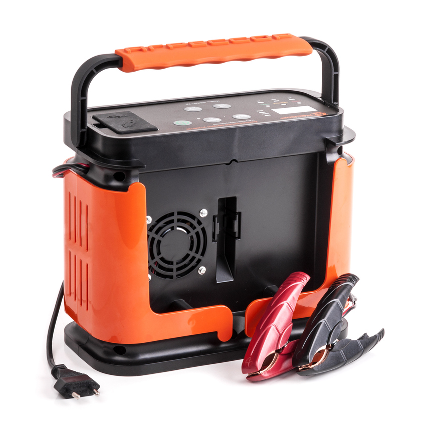 Компактное зарядное устройство с регулируемой силой тока: 2А для мотоциклов, снегоходов, газонокосилок, 6А для аккумуляторов емкостью 15-60 ампер-час, 10А для зарядки стандартных автомобильных аккумуляторов и 15А для больших АКБ с емкостью от 50 ампер-час. Также есть порт USB для подзарядки мобильных гаджетов. На панели устройства можно выбрать силу тока, тип АКБ, а также проверить напряжение батареи.